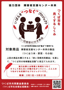 つくほう米・野菜・その他(つくば市役所内“融点” https://yuten.city.tsukuba.lg.jp/ で販売する障害者支援センター未来の製品) 売上の10%を寄付(上限5,000円/月)。