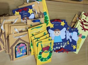 12月18日(木)NHK水戸放送局1階ロビーにて、愛恩幼稚園(水戸市)の園児52名一人ひとりから本会職員へクリスマスの飾りつけをした手づくりの募金袋が手渡されました。