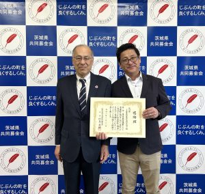 3月12日(木)セキショウ・ウェルビーイング福祉会館において募金贈呈式が行われ、同協議会宮永 栄二会長(写真右)より本会 村島 英嗣会長(写真左)へ目録が手渡されました。