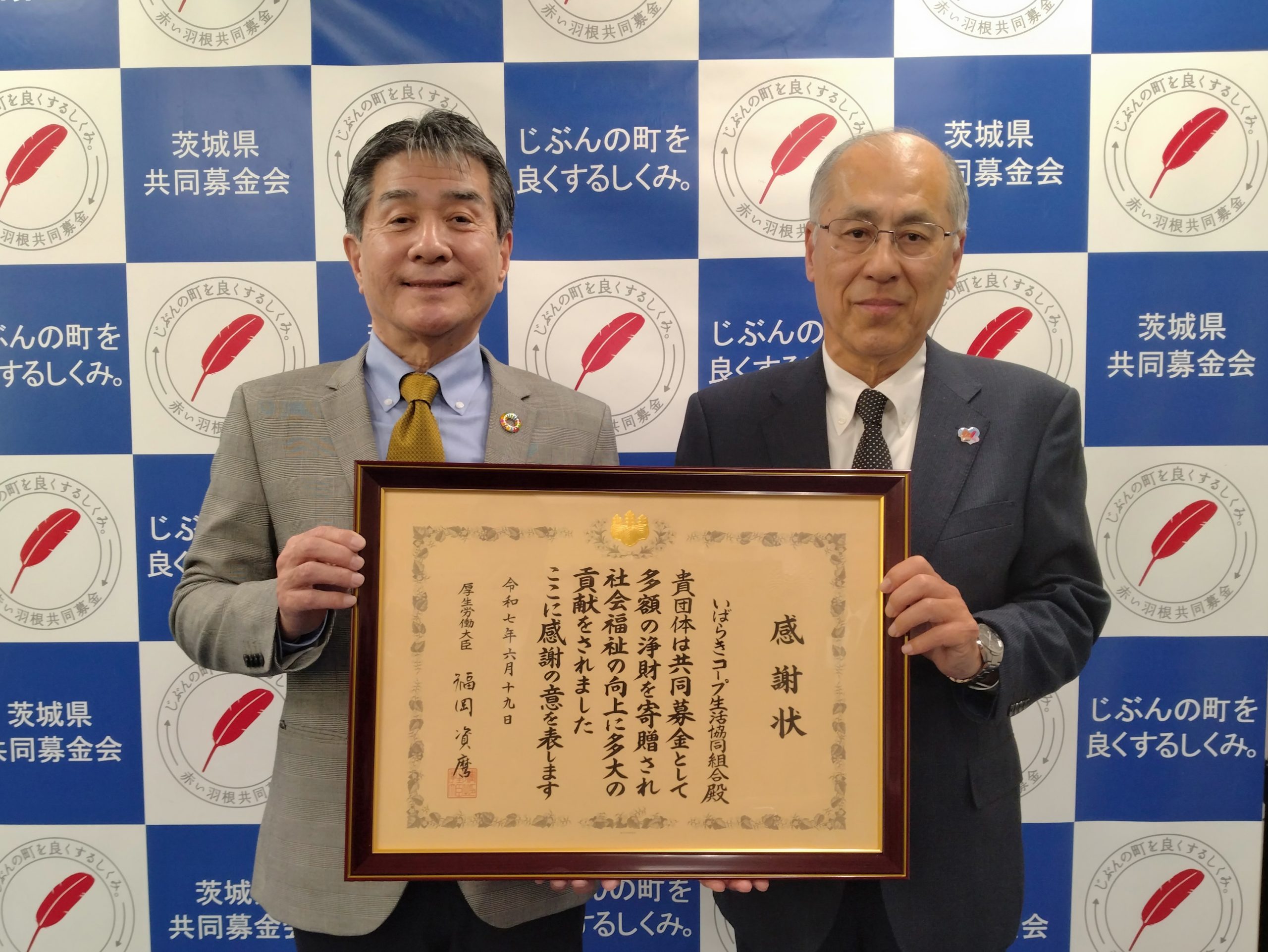 また、昨年度(令和6年度)にいばらきコープ様からご寄付いただきました共同募金に対しまして、この度厚生労働大臣から感謝状が贈呈され、本会会長から代表理事理事長の木村様にお届けしました。